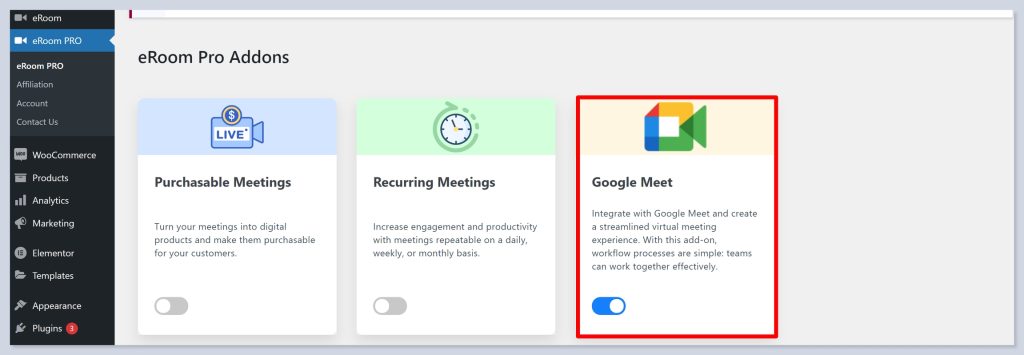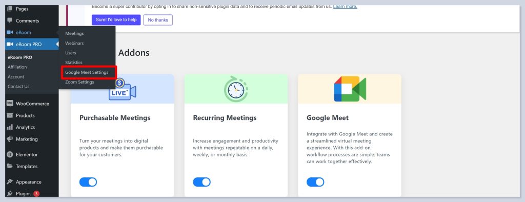 - After enabling the addon, go to the Google Meeting Settings in the eRoom plugin.