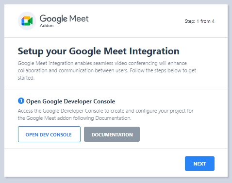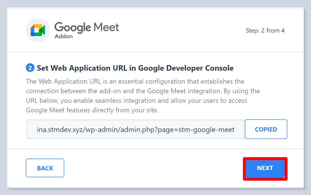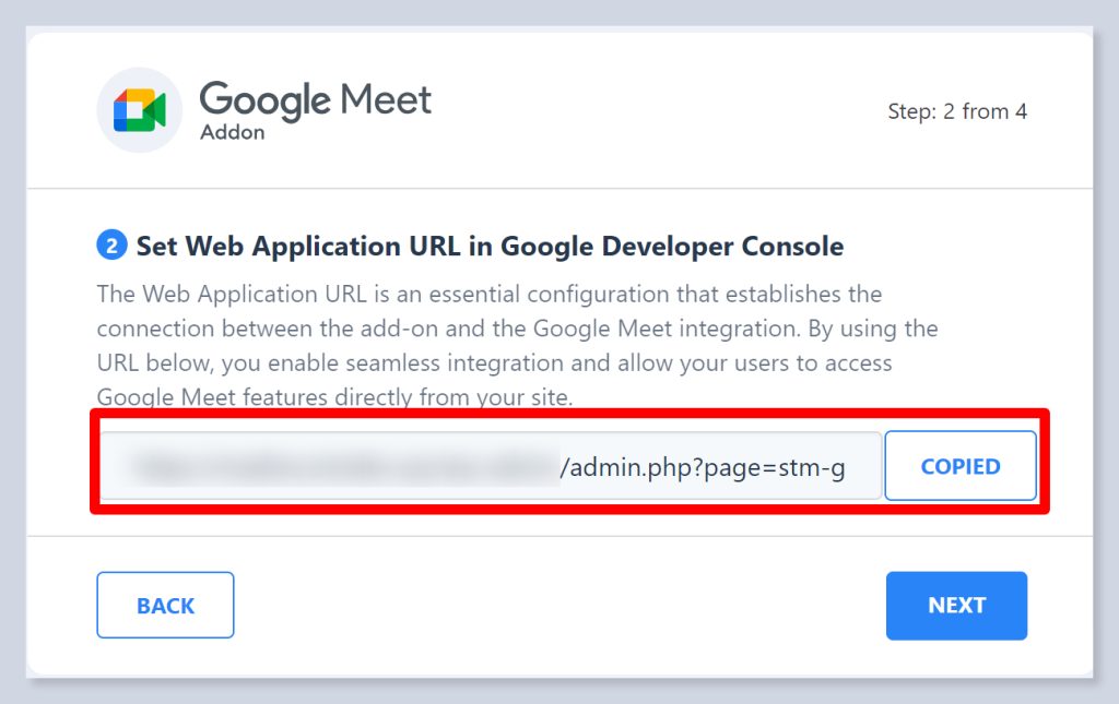 - You will find a link to copy in the 2nd step of the Google Meet addon setup wizard. Copy that link and go back to Google Console.