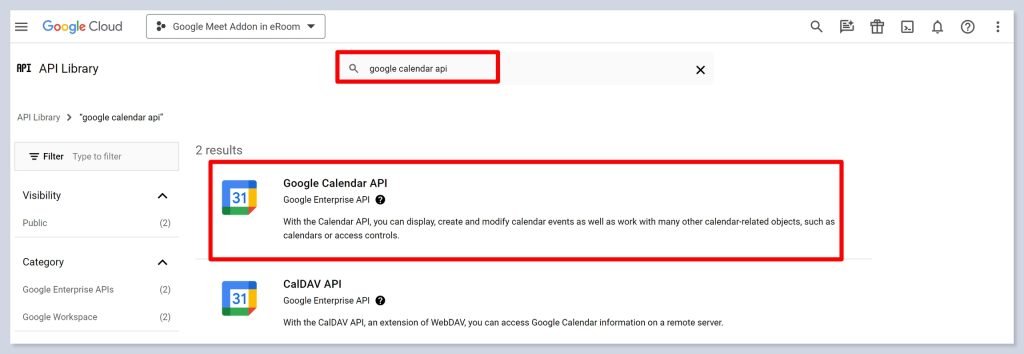- In the open window, type the “Google Calendar” into the search field of the Google API Library.