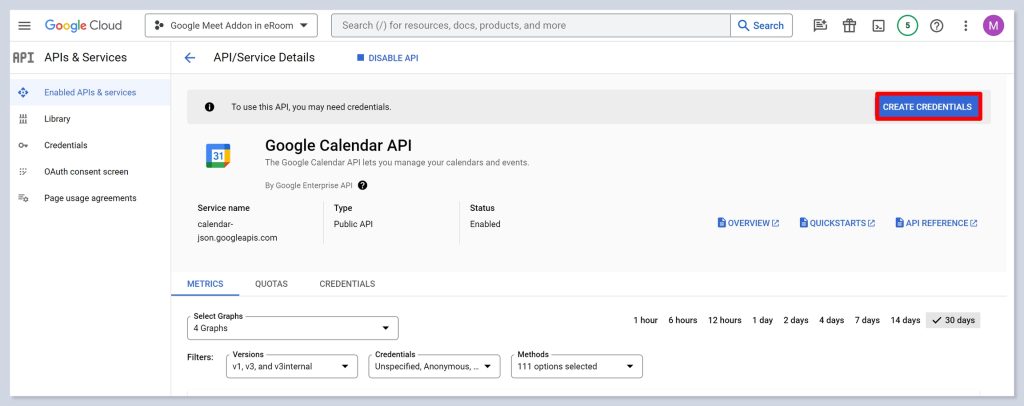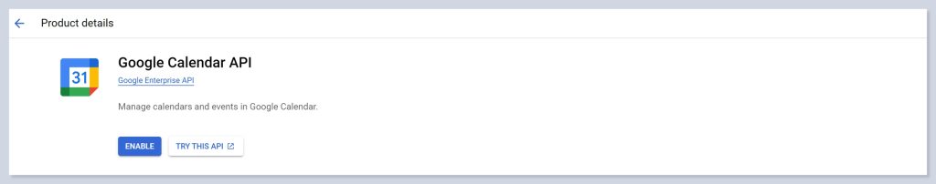 - To activate the Google Calendar API for this project, simply click on the Enable button.