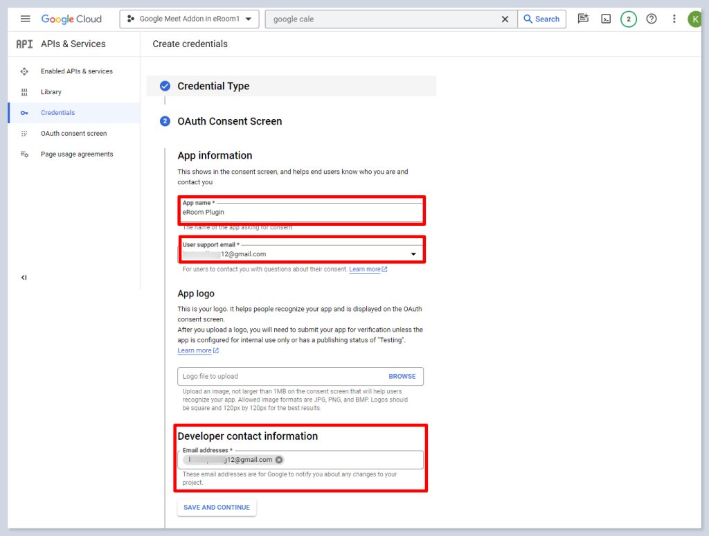 - In the section for the “OAuth Consent Screen“, put the name of your application and include your User support email and Developer Contact email(you can use only one email for these fields).