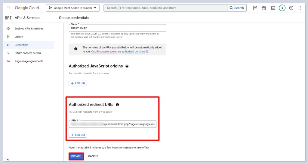 - Paste the link in the designated area for the Authorized redirect URI and click on the Create button.