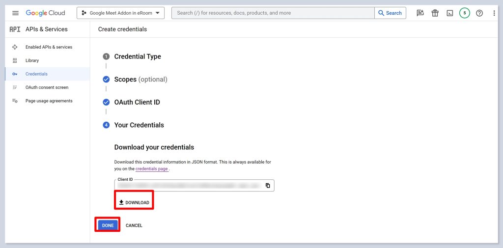 - After creating the credentials, you can then download the JSON file from the credentials dashboard. Simply click on the download icon to continue. And don’t forget to click on the Done button.