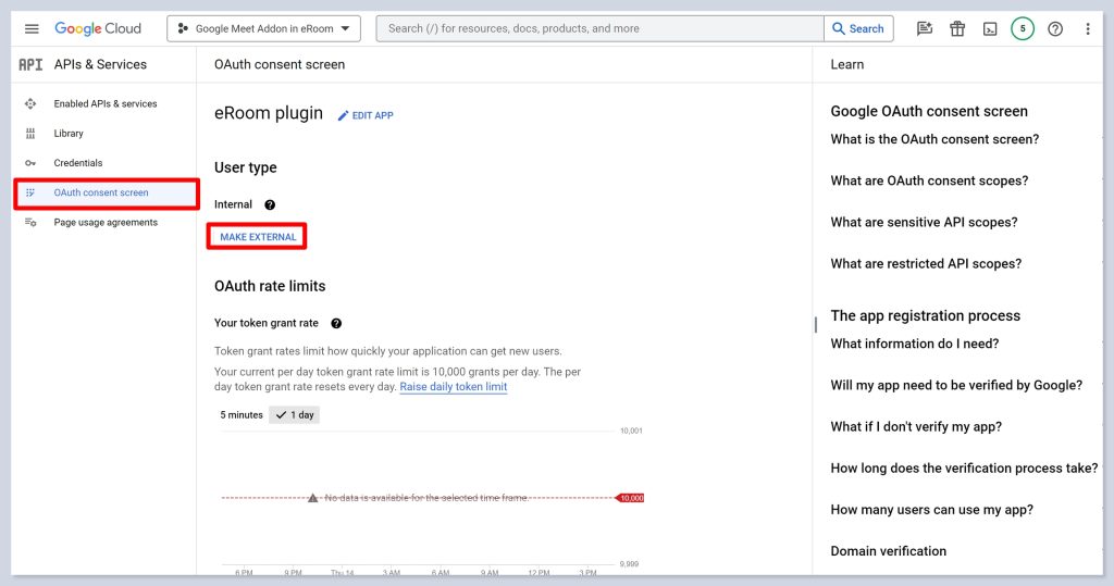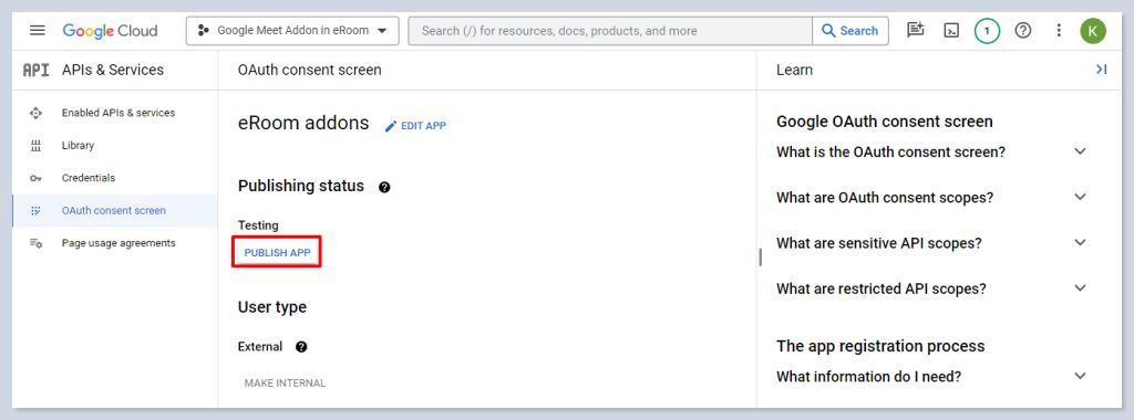 - Finally, go to the OAuth consent screen section and select the option to Make external the app.