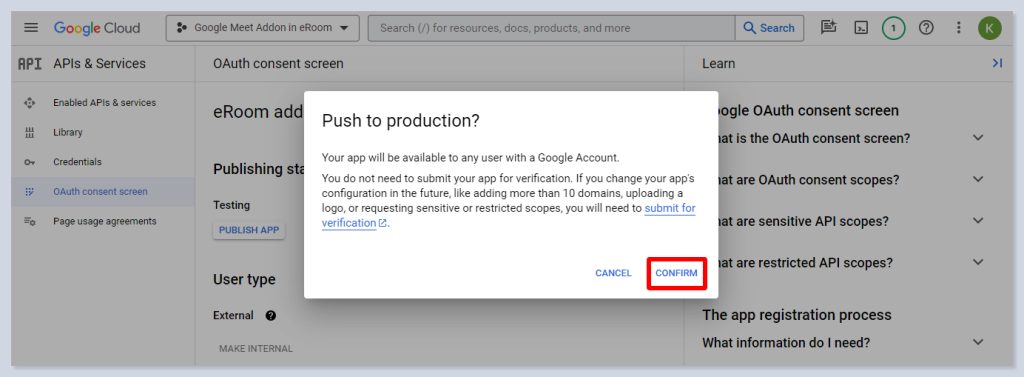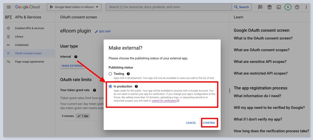 - In the open popup, choose In Production and click on the Confirm button. By doing so, you will enable the authorization for eRoom and Google to use this integration.