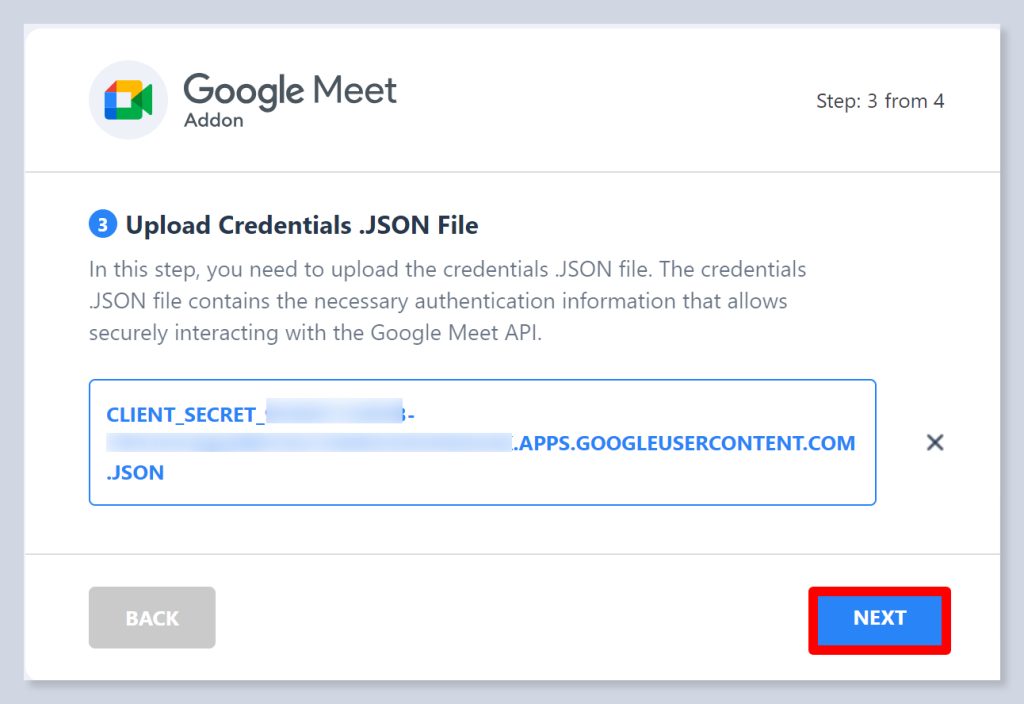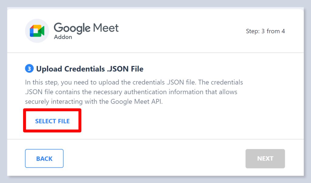 - You will go to the 3rd step of the Google Meet setup wizard. Click on the Select file button and upload the JSON file you downloaded.