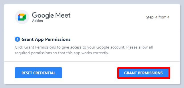 - In the next step of the wizard, grant access to your Google account and click on the Grant Permissions buttons to allow all the permissions you want to have eRoom with Google Meet.