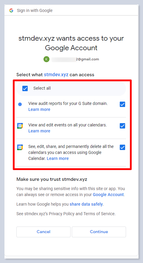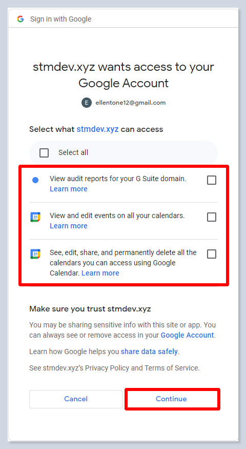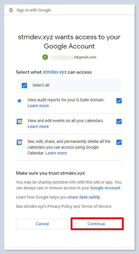 - Grant these permissions: view audit reports for your G Suite domain, view and edit events on all your calendars, see, edit, share, and permanently delete all the calendars you can access using Google Calendar.