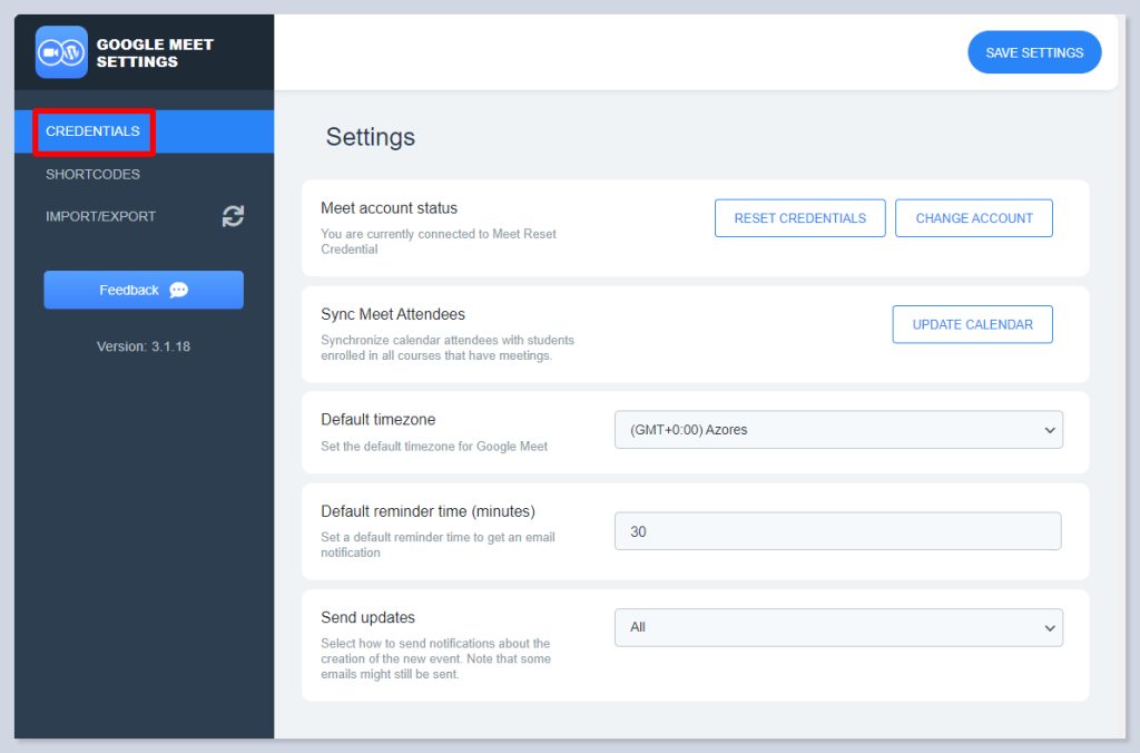 Reset Credentials – Click if you need to reset credentials and set up the Google Meet API settings from the start.