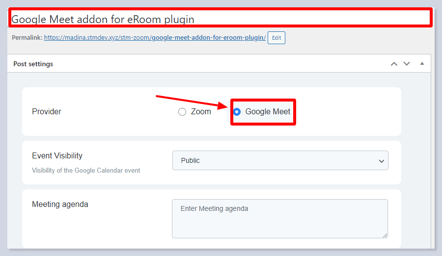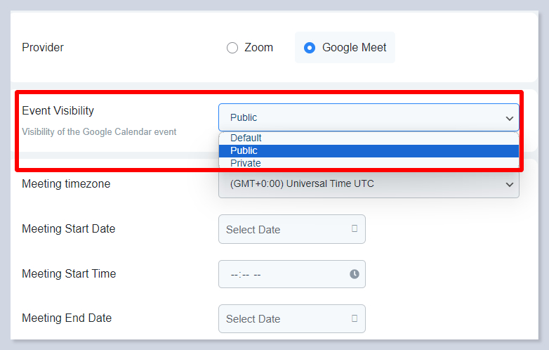Make sure that the timezone of the meeting aligns with the timezone of the WordPress dashboard so that the Google Meet addon works correctly.