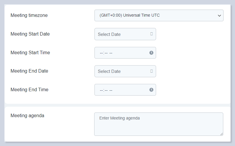 - Select the start and end date and time, timezone and agenda of the meeting.
