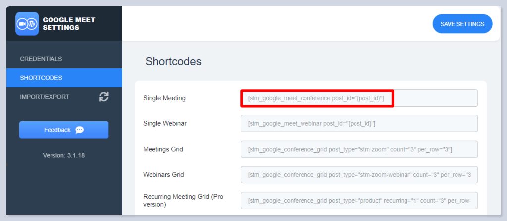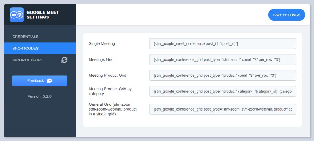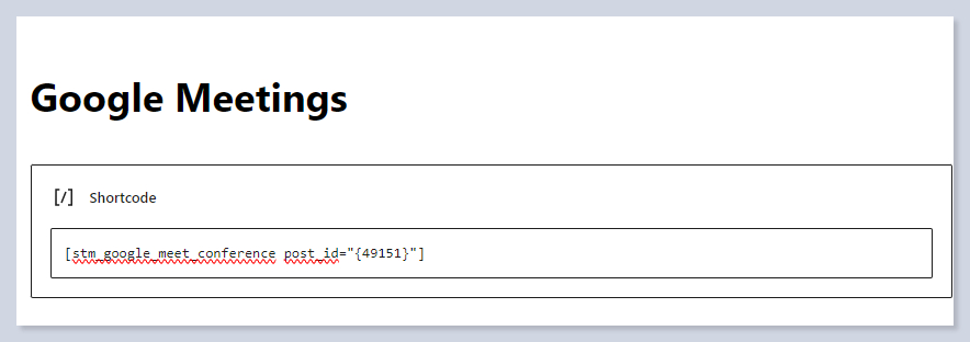 In the Shortcodes section of the addon settings, you can see the shortcodes to implement Google Meet meetings on your page.