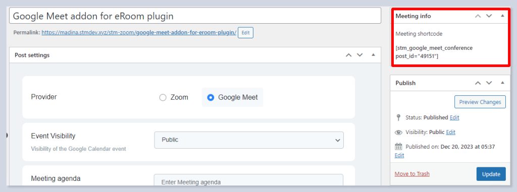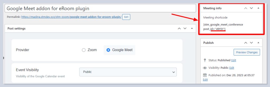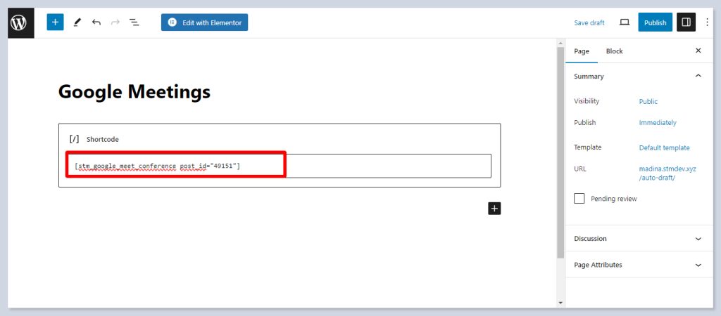 - Add the meeting ID you got after publishing the meeting by pasting the shortcode.