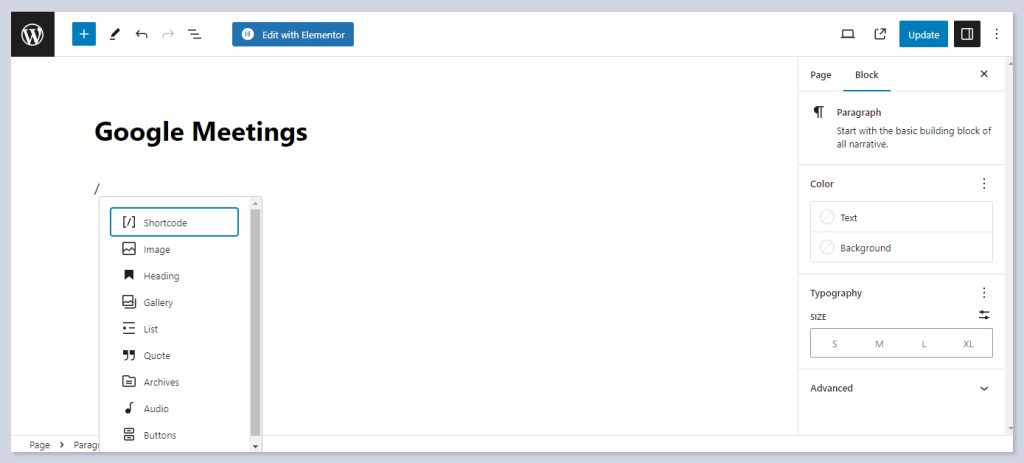 - Type / and choose a block with a shortcode.