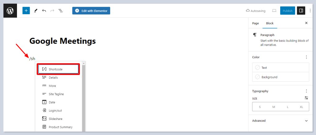 Type / and choose shortcode: