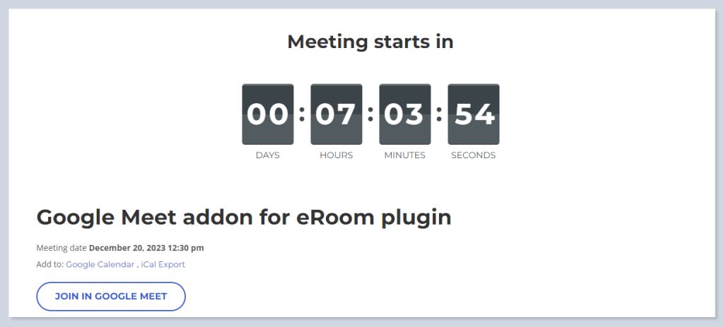 Google Meet Addon in the eRoom plugin lets you integrate with Google Meet and create Google meetings on your website.