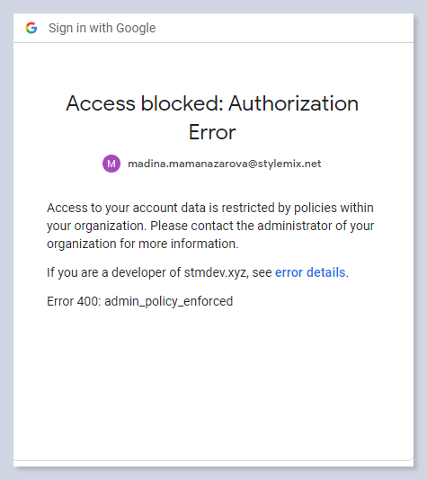 This means that the organization you work for has restricted access to your account data. You need to contact the admin of the emails you use for work. Or you can use a simple email account without a custom domain to create an app on Google Dev Console and grant permissions.