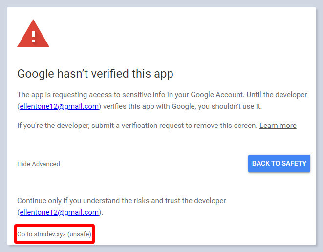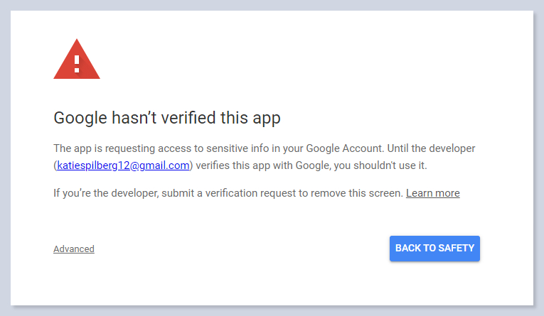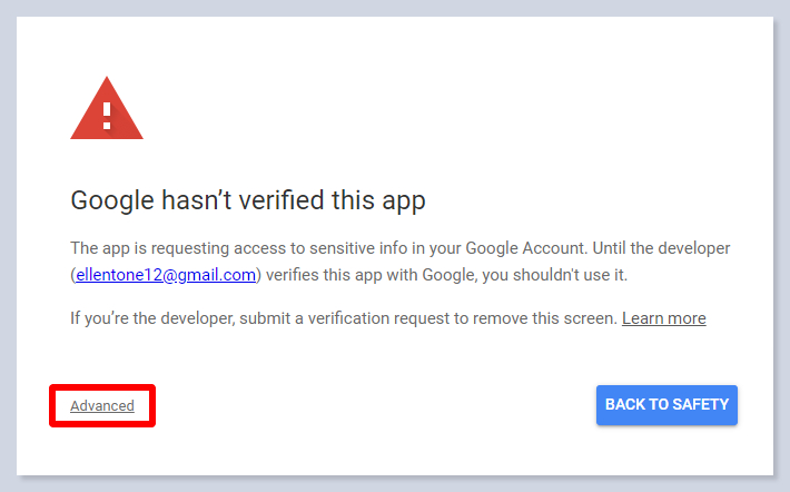 In this case, Google may suspect your app and don’t allow access to the data. To solve this problem, you need to verify your app following instructions from Google. Or click on the Advanced button: