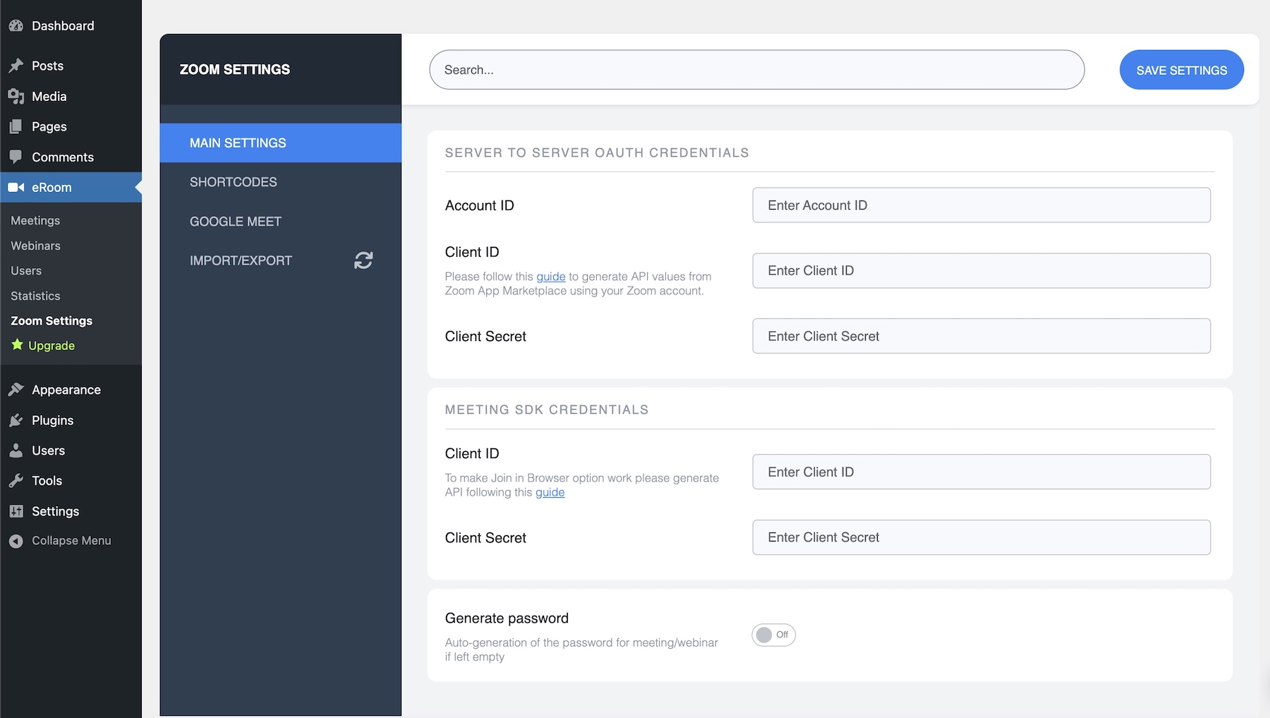 After the plugin activation, there will be appeared the eRoom menu on your dashboard panel. Open the page with the Settings: eRoom > Zoom Settings.